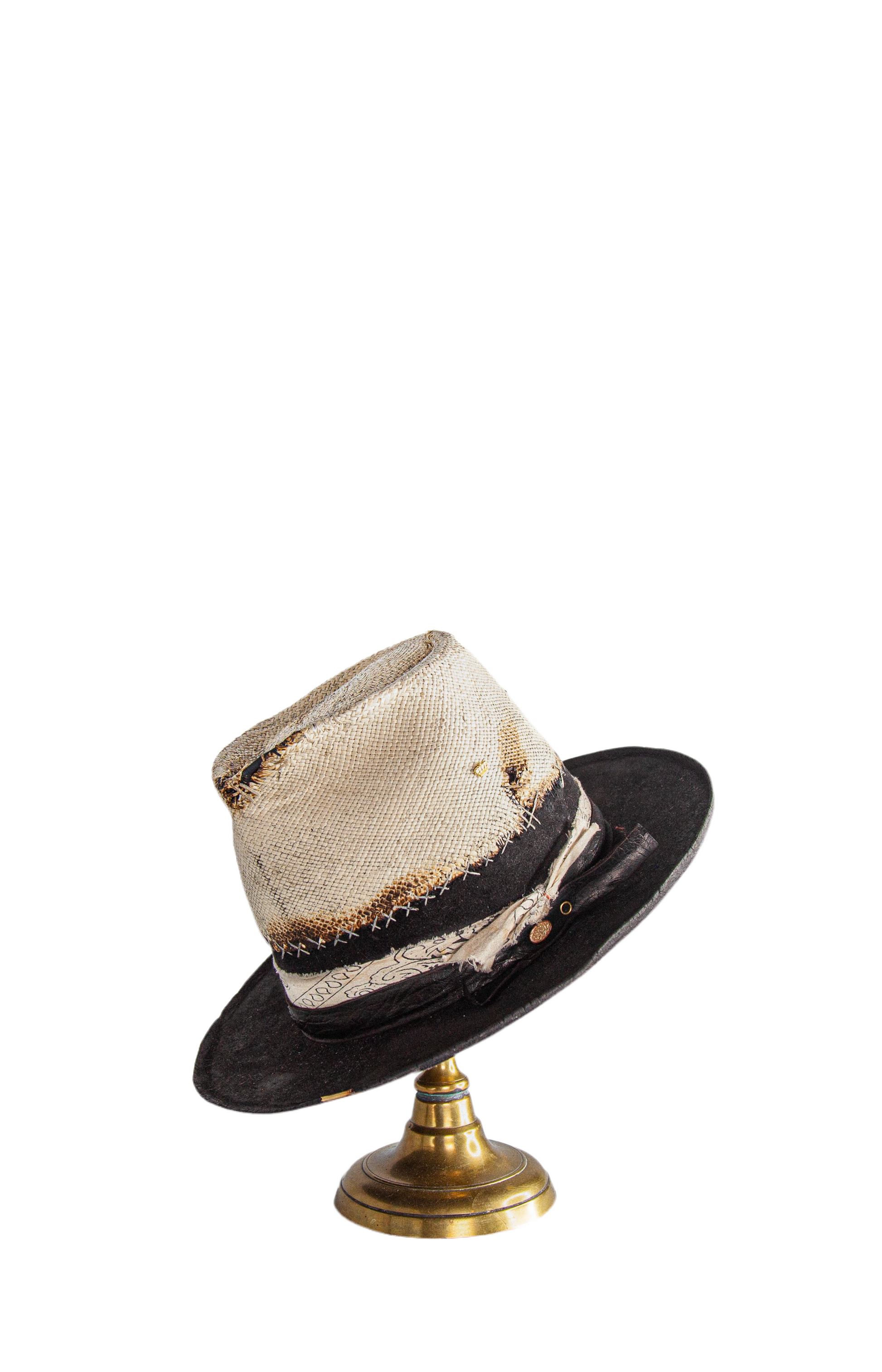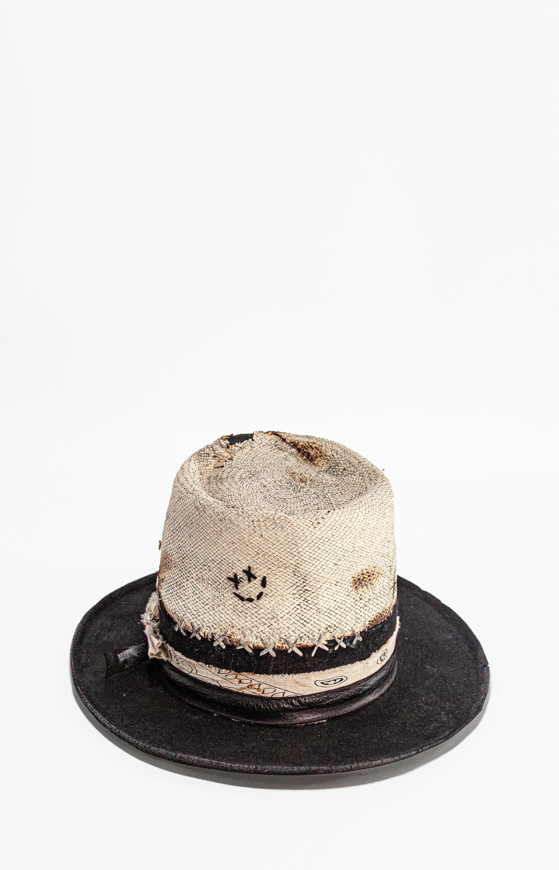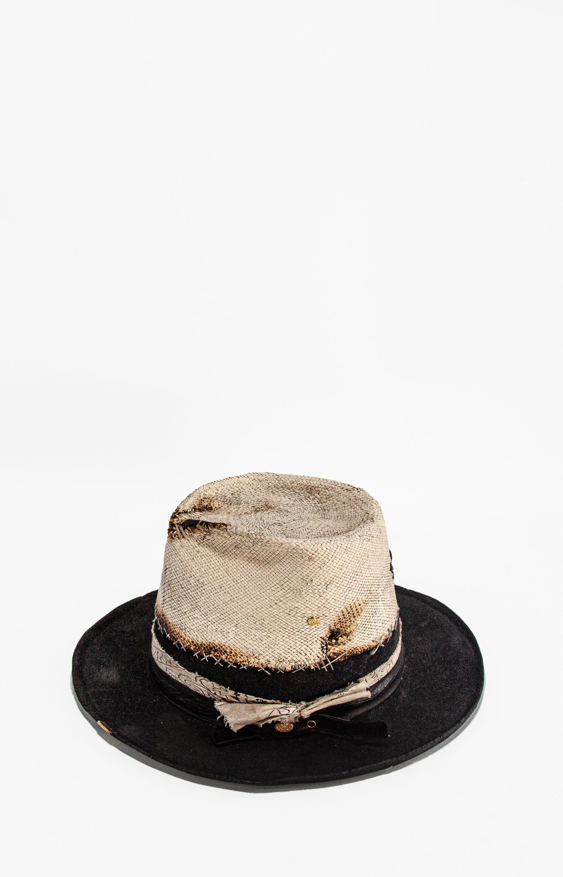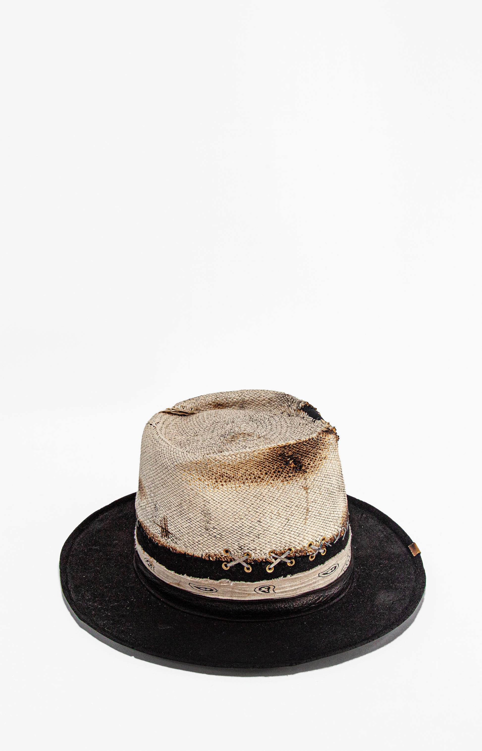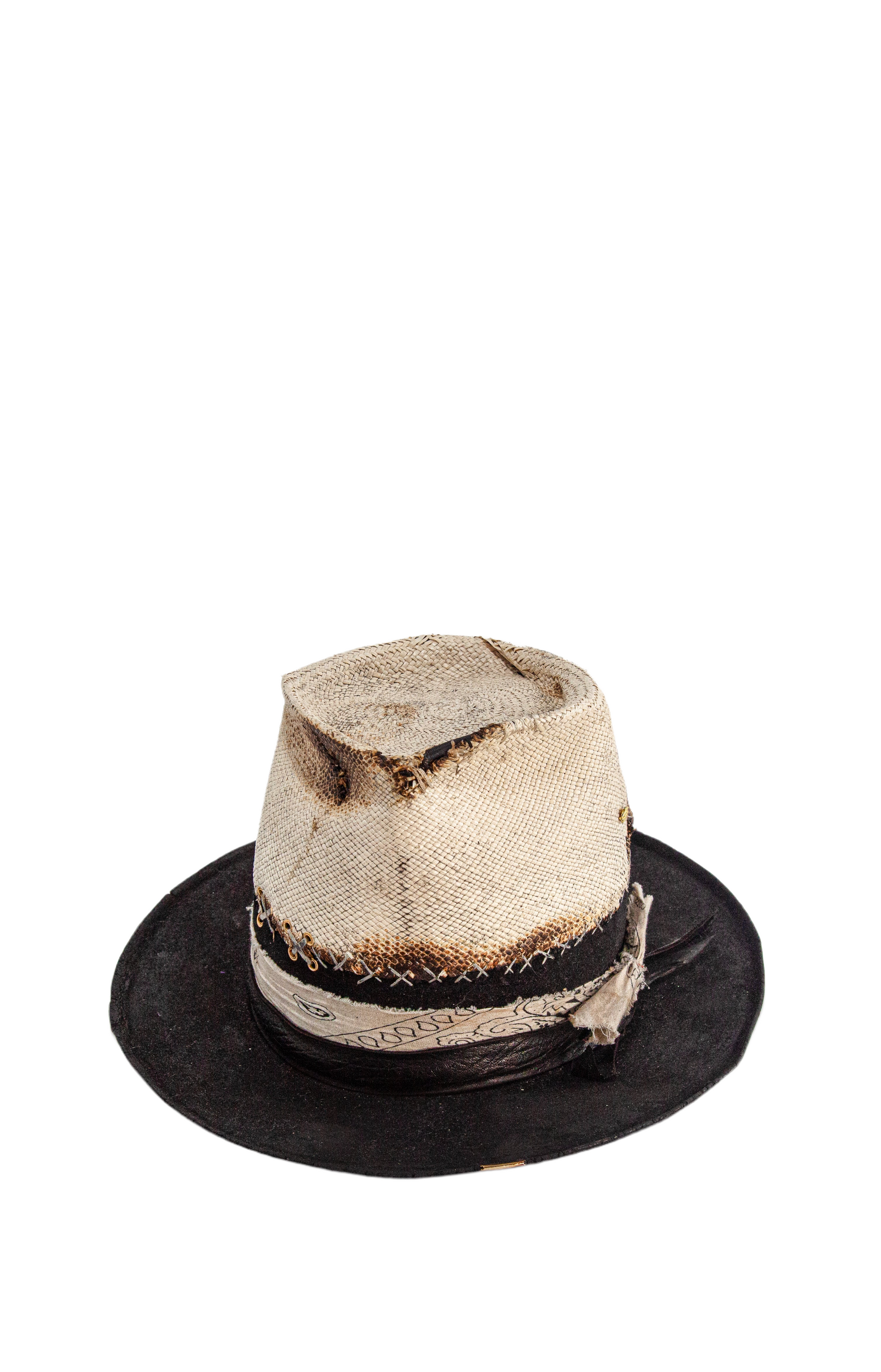 UNIQUE. Crafted with a combination of luxurious fur felt and tightly woven straw. Features a design that seamlessly blends the two materials. It stands at 7 inches tall with a 3-inch brim. The crown is adorned with metal eyelets, a bandana ribbon, and a distressed black leather band. Available in sizes 60, 61, 62, and 63. Embrace style, quality, and versatility with our exceptional hat.